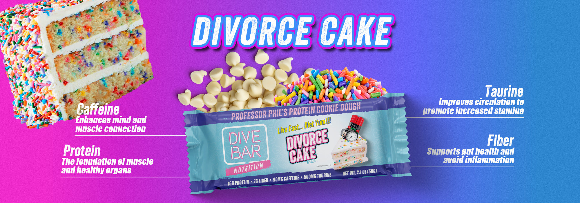 No more fake people. No more fake TASTE! We like cake but cake-flavored snacks tend to be a bit overwhelming and taste artificial. Now enjoy all the super-charged powers of a Dive Bar with vanilla icing flavor, white chocolate chips and sprinkles. Best of all, it fits your macros!