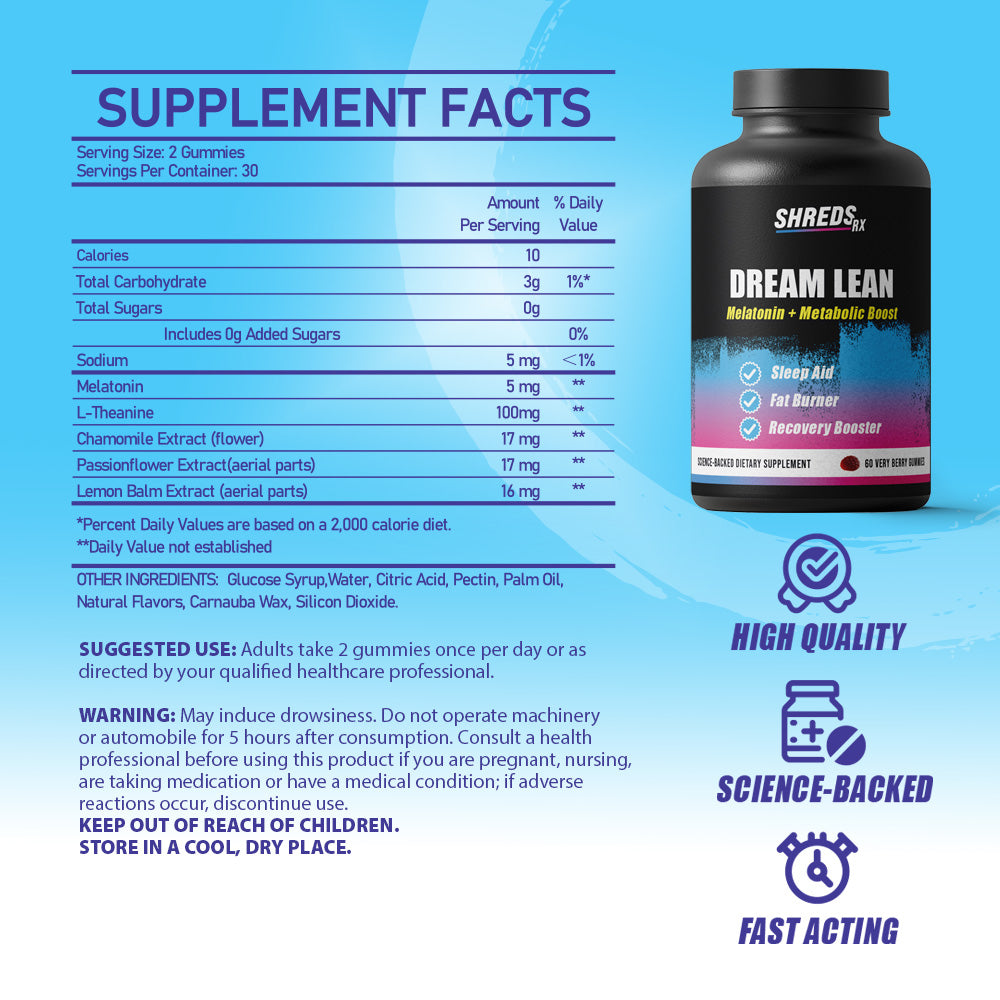 Sleep isn’t just rest — it’s recovery. Dream Lean helps you fall asleep faster, stay asleep longer, and wake up feeling lighter, not groggy. With a precise blend of melatonin, L-theanine, chamomile, and passionflower, it promotes deep relaxation while supporting overnight repair and metabolic balance. Ideal for athletes, shift workers, or anyone chasing next-level results. Dream hard, wake lean, repeat.