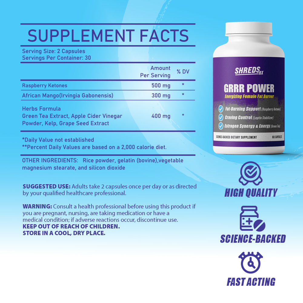 Cutting back doesn’t mean slowing down. Grrr Power fires up your metabolism and keeps your energy steady all day without the jitters or crash. This advanced blend combines raspberry ketones, green tea, apple cider vinegar, African mango, and kelp to boost fat metabolism, balance cravings, and support hormonal energy. Power through your day, not just your workout.