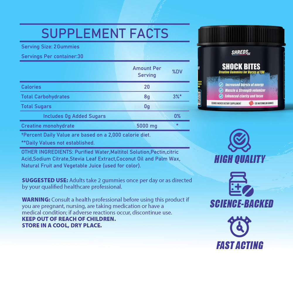 Creatine doesn’t have to be chalky or boring. Shock Bites delivers fast, delicious support for strength and explosive energy in a gummy that actually tastes good. Whether you are lifting heavy or pushing for one more set, this is your pre-workout secret weapon. Explosive energy and instant power in a grab-and-go format built for performance. Make every workout hit harder.