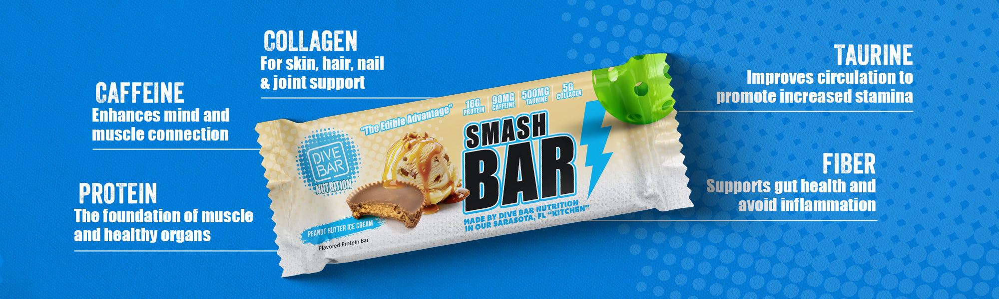 Smash Bars by Dive Bar Nutrition! The ultimate pickleball power-up! Each bar delivers 16g protein, 90mg caffeine, 500mg taurine, and 5g collagen to fuel your rallies and recovery. Designed for players who want The Edible Advantage, Smash Bars keep you energized, focused, and ready to dominate the court.