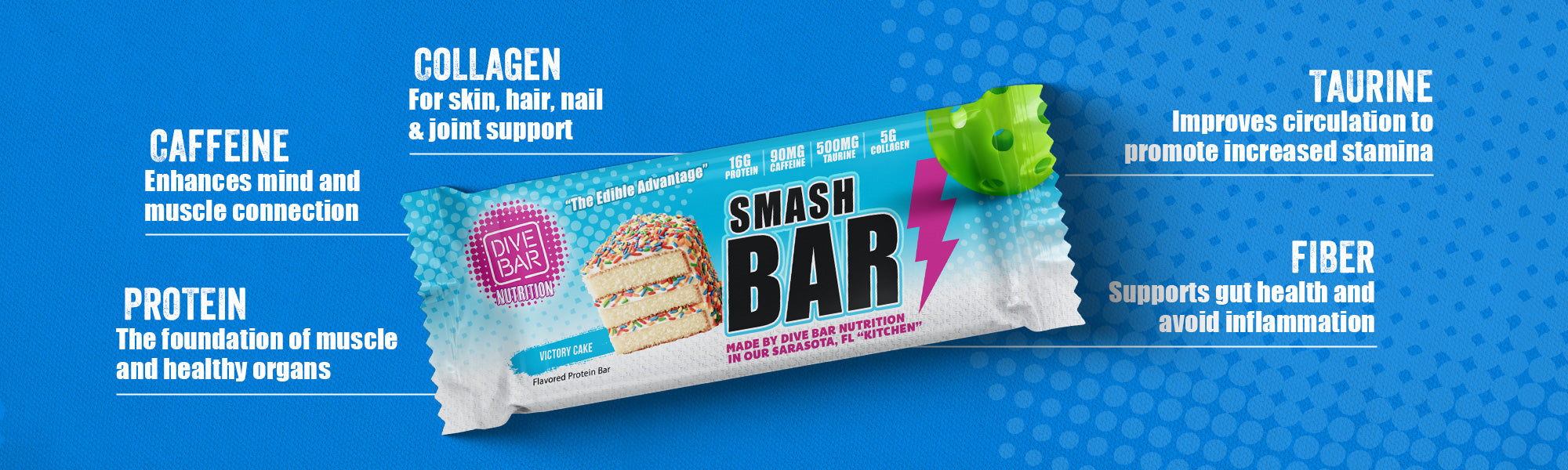 Smash Bars by Dive Bar Nutrition! The ultimate pickleball power-up! Each bar delivers 16g protein, 90mg caffeine, 500mg taurine, and 5g collagen to fuel your rallies and recovery. Designed for players who want The Edible Advantage, Smash Bars keep you energized, focused, and ready to dominate the court.